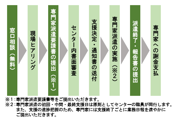 ・前年度専門家派遣を受けている場合は、同一企業への同一のテーマ、かつ同一専門家による派遣は、原則できません。